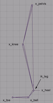 然后选择 'left_leg' 组中 x_pelvis 和 r_toe 关节; 'right_leg' 组中的 x_pelvis 和 r_toe ,将它们隐藏 (Display Hide Hide Selection) 。将 'left_leg' 组中 pole_leg locatoras 重先命名为 `pole_left_leg` ;如此类推,将 'right_leg' 组中也重先命名为 `pole_right_leg` ;将 'left_leg' 组中的 'foot' 组命名为 'left_foot' , 'right_leg' 组中的命名为 `right_foot` 。