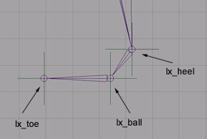 现在我们从 outliner 大纲视图中选择 r_toe 关节, template 它( Display Object Display Template) 。再选择 rik_ball 和 rik_pelvis ikhandles 以及三个 locator(lx_toe, lx_ball, lx_heel) ,隐藏它们 (Display Hide Hide Selection) 。