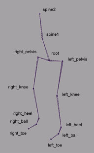 用 (Skeleton Joint Tool) 新建三个关节(图示),命名为 root,spine1 和 spine2 。然后 left_pelvis 关节与 root 关节连接。 选择 left_pelvis 关节,进行镜像 (Skeleton Mirror Joint) 命令,将镜像的一串关节分别命名为 right_pelvis,right_knee,right_heel,right_ball 和 right toe 。