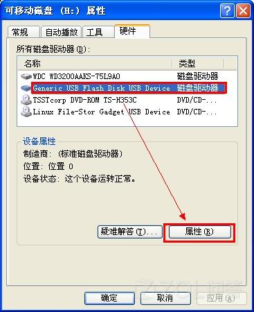 2 在所有磁盘驱动器列表中选择名称含有USB的磁盘驱动器,单击右下方的“属性”按钮。