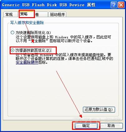3 在打开的窗口点击“策略“选项卡。将策略改为“为提高性能而优化”。确定即可解决被写保护的问题。