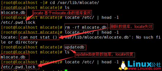 注意 :如果这个文件删除了, locate就无法使用了。需手动手动更新数据库( updatedb ),或重启系统,locate才能恢复作用