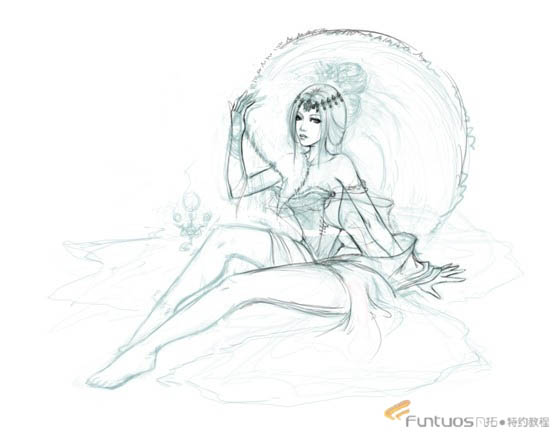 9、画出头上的头饰及身披的蕾丝,且注意头饰的设计,要强调富贵人家的华丽感。调整身体的结构,适当的拉长双腿。