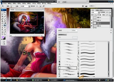 11、进一步的刻画背景,用笔刷画出一些枝叶,调整衣服的颜色。