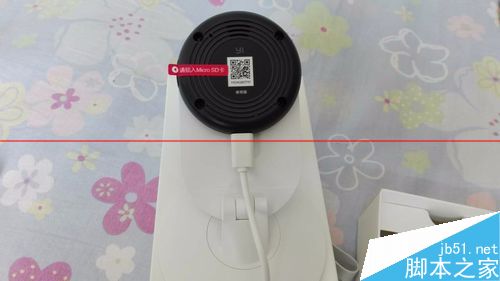 2、如上图所示,小蚁摄像机背面有提示插入内存卡的地方,我还没有准备所以就不插了,这样就不支持录像了,只能实时监控。如下图摄像机的电源插口在下面,如果摄像头和底座靠的太近应该不是很方便。