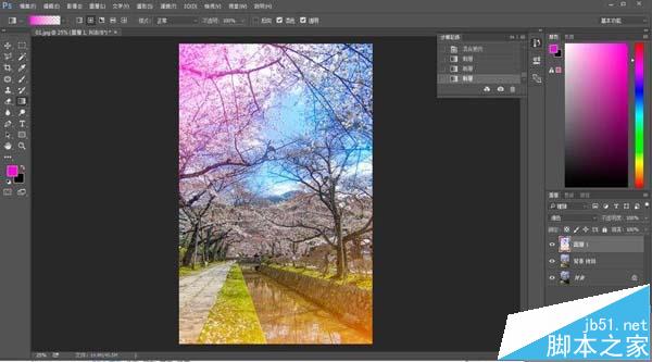 在樱花位置拉出粉红色,底部则拉出橙色。