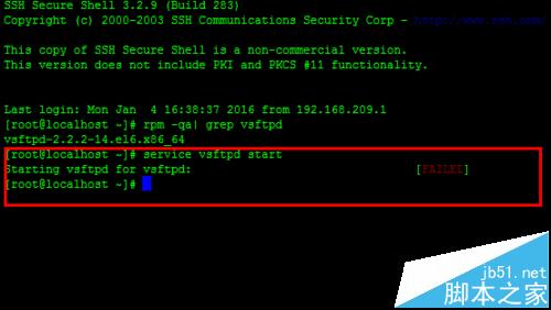 2、启动vsftpd服务:service vsftpd start,如图启动失败