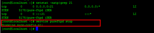 3、检查ftp端口20,21是否被占用:netstat -natp |grep 20 ,netstat -natp |grep 21 端口21被pure-ftpd 占用