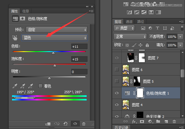 是不是更好看,这时候校服的颜色还是不好看,不够通透!所以我们在色相饱和度里面调整一下蓝色。