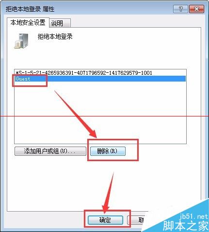 9、分别找到这几项“拒绝本地登录”和“允许本地登录”,把拒绝的guest项删除,如图