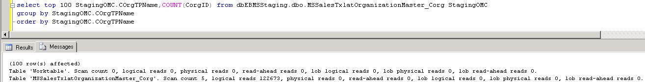 select top 100 StagingOMC.COrgTPName,COUNT(CorgID) from dbEBMSStaging.dbo.MSSalesTxlatOrganizationMaster_Corg StagingOMC