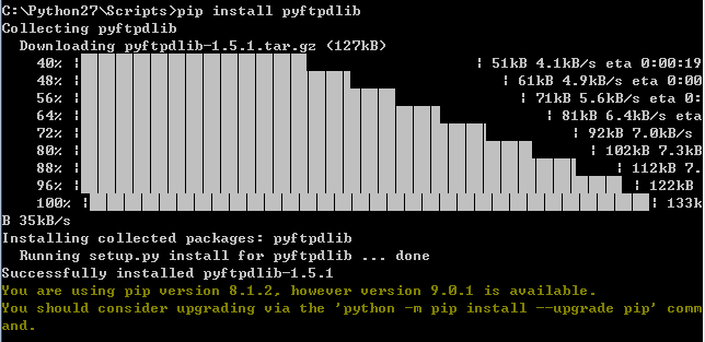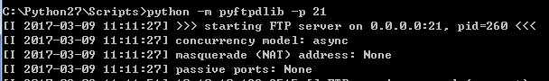 进入Python27\Scripts目录,执行:pip install pyftpdlib命令,显示如下,表示安装成功