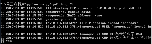 进入需要开放的ftp服务目录下,执行:python -m pyftpdlib -p 21,显示如下,表示ftp服务搭建成功