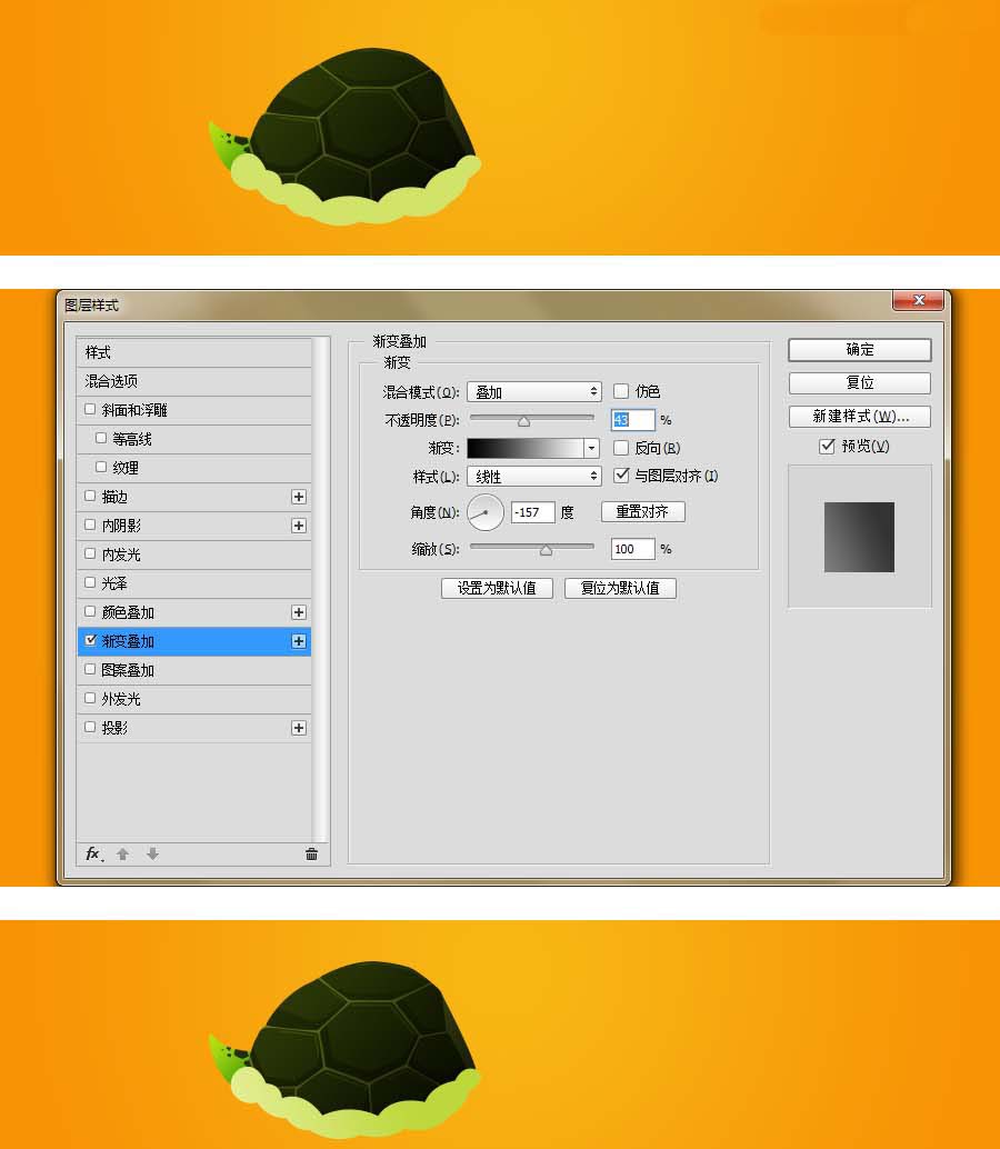 2.3 好了~我们接下来画乌龟的小尾巴。画完尾巴的形状依然加一个渐变叠加(纯黑到纯白),最后尾巴上加一些斑点。