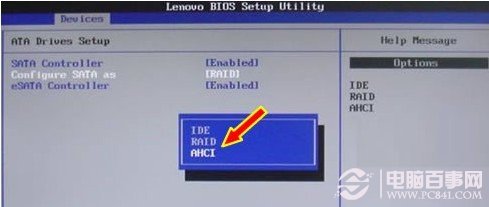 进入Bios开启硬盘AHCI模式的大致步骤是:重新启动电脑,启动电脑时按Del键进入BIOS,依次选择Devices→ATA Drives Setup→Configure SATA as→AHCI,最后按F10键保存并退出BIOS,如下图: