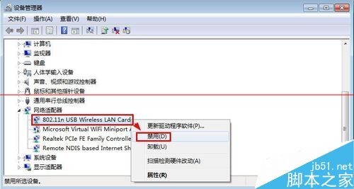 8、当然大家禁用无线网卡,也可以打开电脑的设备管理器,然后在网络适配器中找到自己的无线网卡,然后单击鼠标右键,选择禁用也是可以的。