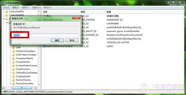 3、我们双击“waitToKillServiceTimeout”,在弹出的“编辑字符串”窗口,可以看到默认的“数值数据是12000”,即代表12秒。