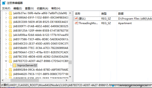 2、打开注册表编辑器,依次定位到 “HKEY_CLASSES_ROOT\Wow6432Node\CLSID\{AB7EE7CD-AD07-4A27-B986-C7D5A31C8098}\InprocServer32”项,点击“InprocServer32”;