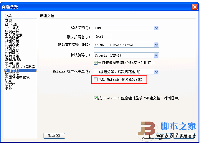 另外,DreamWeaver CS3也有类似的选项,在“首选项”中,如果选择 Unicode (UTF-8) 作为默认编码,则可以选择“包括 Unicode 签名 (BOM)”选项,以在文档中包括字节顺序标记 (BOM)。否则,不带BOM:
