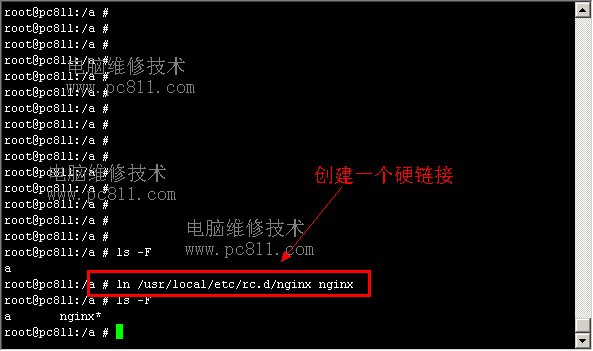 使用该命令在当前目录下创建一个名为nginx的文件,该文件代表硬盘上的另一个地址/usr/local/etc/rc.d/nginx。现在利用目录当前目录中的nginx就可直接访问同名文件了(当然已经创建了该连接,如果我们想编辑nginx这个文件时,我们只需要执行“vi nginx”,而不需要执行“vi /usr/local/etc/rc.d/nginx”这么长的文件路径了,当然如果想执行时也无需要输入比较长的路径了)。