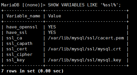 MariaDB [(none)]> show variables like ‘%ssl%';