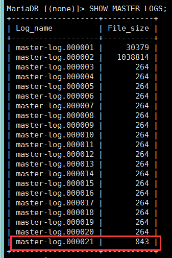 MariaDB [(none)]> SHOW MASTER LOGS;