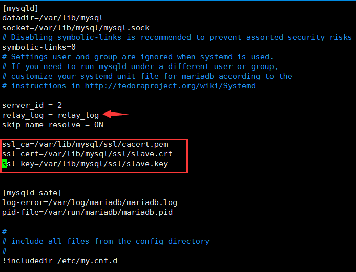 编辑 /etc/my.cnf ,由于是从服务器,所以需要开启中继日志(relay_log),且server_id不应与同一层面的mysql服务器相同