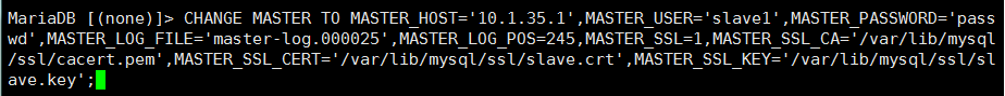 MariaDB [(none)]> CHANGE MASTER TO MASTER_HOST='10.1.35.1′,MASTER_USER='slave1′,MASTER_PASSWORD='passwd',MASTER_LOG_FILE=' master-log.000025 ‘,MASTER_LOG_POS= 245 , MASTER_SSL =1, MASTER_SSL_CA ='/var/lib/mysql/ssl/cacert.pem', MASTER_SSL_CERT ='/var/lib/mysql/ssl/slave.crt', MASTER_SSL_KEY ='/var/lib/mysql/ssl/slave.key';