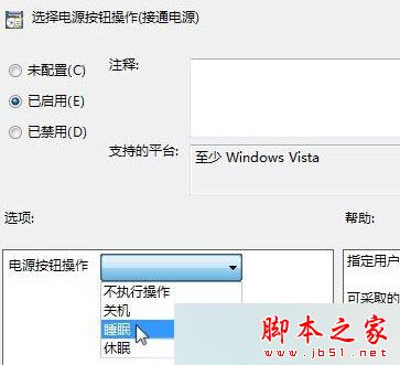3、在右侧我们可以双击打开需要设置的选项,比如“选择电源按钮操作(接通电源)”,然后点击下面的“已启用”,在“选项”下方“电源按钮操作”下拉菜单中选择需要设置的方式,点击应用并确定即可。