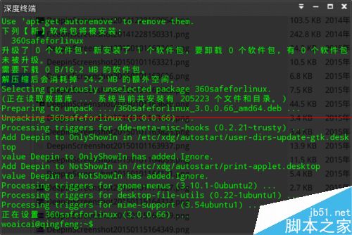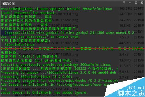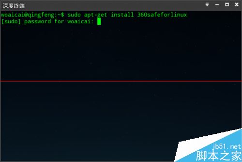 1、启动深度终端,输入"sudo apt-get install 360safeforlinux"回车,输入管理员密码