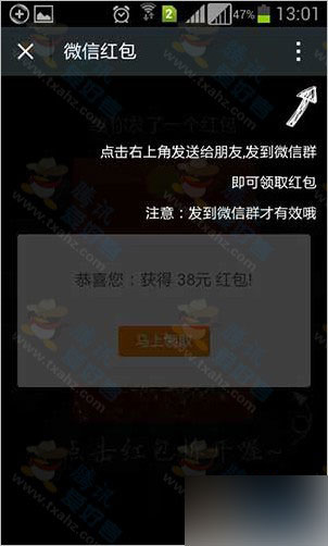 拆开红包,哇!中了38元。想领取红包吗?没这么简单,你必须得转发,还必须得微信群。推广者只需要发一条,就可以形成爆炸式转发,当然新人是看不出其中的猫腻。转发之后,于是我们看到这个页面,我也是到了这一步一下就明白其中的玄机了。