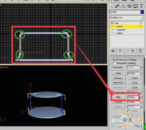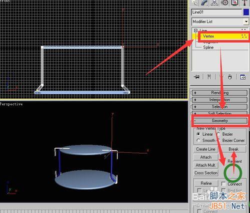3dmax9英文版利用二维线形制作铁艺圆凳 第3步骤和第8步骤是重点 第三步骤讲的是如何在渲染类下设置参数 使得绘制的线形产生三维效果 第八步骤讲的是如何为直线顶点设置圆角 需要将面板向下拖动才能看到geometry