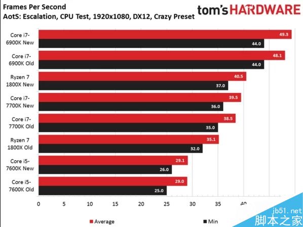 在CPU测试中,TH的结果显示Core i7-6900K及Core i7-7700K平均帧也有所提升,但增幅较小,性能提升并不明显,而Ryzen 7 1800X新旧补丁下平均帧从35.1fps提升到了40.5fps,提升15%,已经超过Core i7-7700K了。