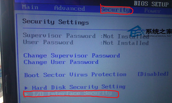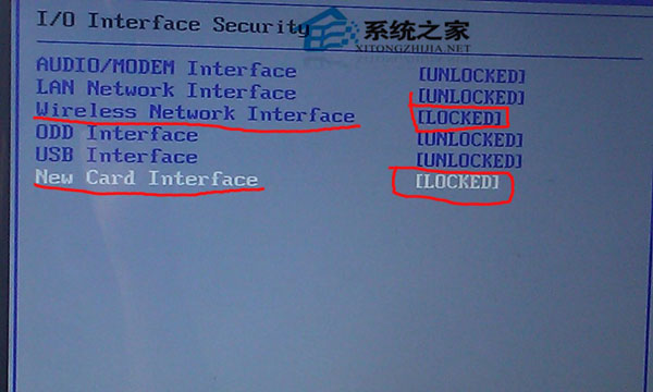 按键盘上的上下键,把光标移动到I/O Interface Security 选项,敲回车,进入下图: