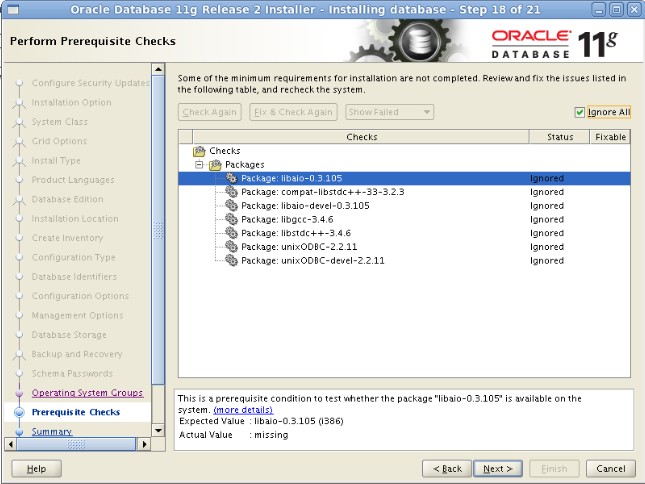 图-19 安装程序对环境进行检查,由于CentOS的32bit程序包都是i686的,而oracle要求i386,所以此处会失败,忽略即可。点击next