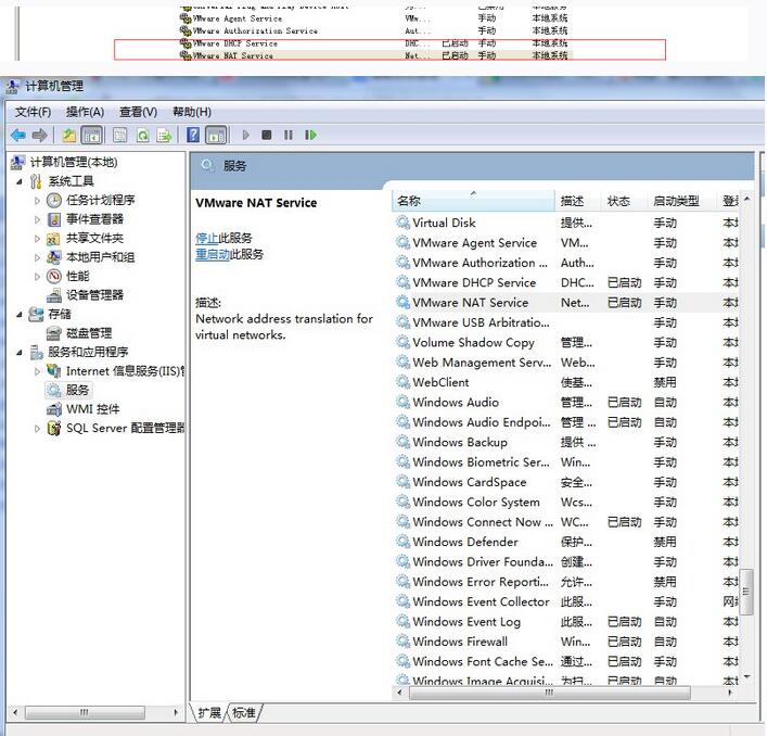 3)、进入Windows操作系统,然后右键点击我们的电脑,进入到管理界面 计算机-> 管理->服务和应用程序->服务,找到如下服务进程 VMware DHCP Service, VMware NAT Service。 分别点击右键->启动