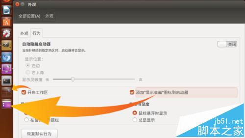 3、在与“外观”并列的“行为”选项卡中,还有三项设置与启动器有关,分别是:启动器是否自动隐藏的开关;是否显示“工作区”按钮的开关;以及是否显示“显示桌面”按钮的开关。可以根据需要开启或关闭这些开关,以使启动器的运行行为更符合自己的需要。