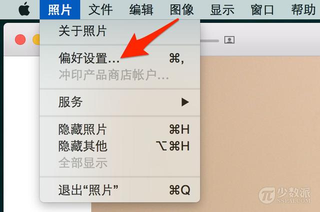 - 在菜单栏中点击「照片」项,然后选择「偏好设置...」项(或按下 Command+, 快捷键);