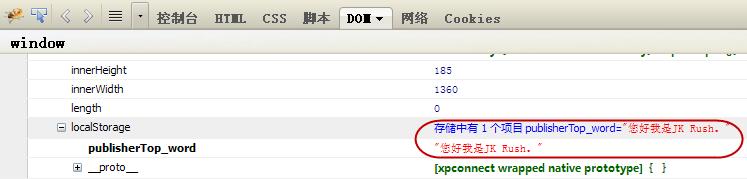 同样,我们打开Firefox的“Firebug”(F12),然后我们选择“DOM”选项,这时我们需要查找window的对象localStorage,这样就可以看到保存在localStorage中的数据了。