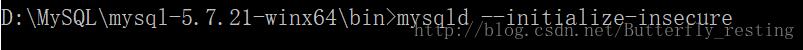 4. 以管理员身份进入命令行(可在小娜搜索输入cmd找到),并进入X:\MySQL\mysql-5.7.21-winx64\bin目录下输入命令:mysqld --initialize-insecure (生成无密码的root用户) 后,在mysql-5.7.20-winx64 目录下就会出现data文件