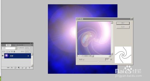 3、然后执行滤镜/扭曲/旋转扭曲,设置角度(如360度)。然后复制背景图层,对图层副本作90度顺时针旋转。再设背景副本的模式叠加,默认80%(不透明度)。也可以设柔光或亮光,效果不同。