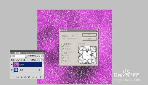 2、再复制一次图层1,滤镜/模糊/径向模糊。数量自定,方法缩放。品质最好。然后重复上述操作,数量比前一次小一倍。方法旋转。然后复制图层1副本得到副本2,滤镜/模糊/高斯模糊,半径2,混合模式为颜色减淡。不透明度50%。合并图层1两副本。