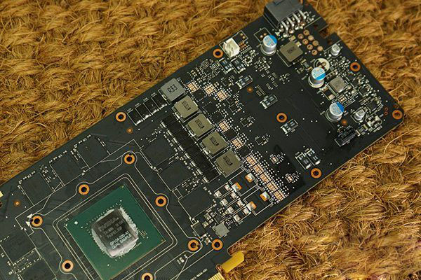 我们拿到的这张GTX1070是Founder Edition的版本,也是由NVIDIA亲自生产,显然是和GTX1080共用一块PCB设计的,大多数的元件都和GTX1080一样,只是少量地阉割了一些电容和电感。