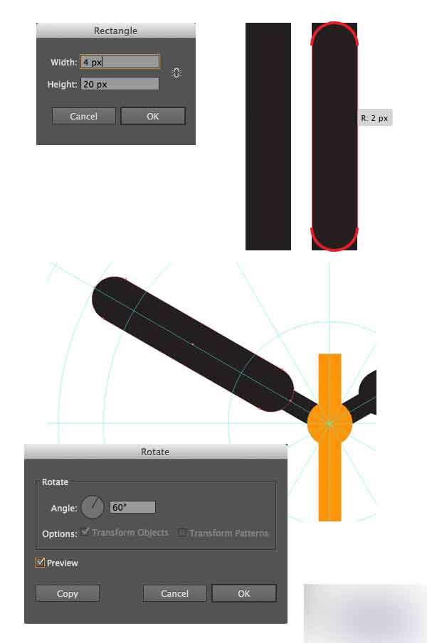 创建另一个4 x 20 px尺寸的矩形作为我们的时针。 使其变圆,旋转60度然后放在与分针相反的一变。