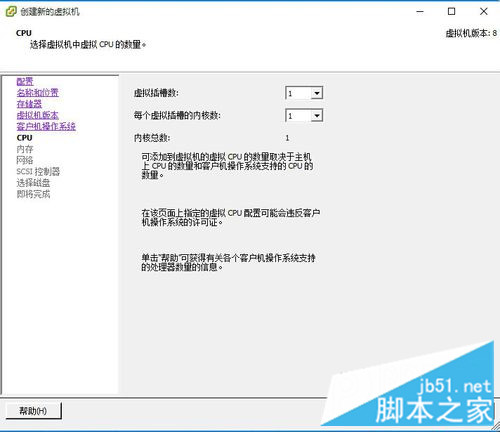 进入“CPU”界面,选择虚拟插槽数及每个虚拟插槽的内核数,一般默认就可,如果主机够强悍,想使虚拟机运行更快,可以自行根据实际情况配置,然后点击“下一步”按钮。