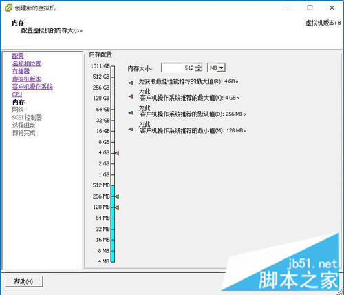进入“内存”界面,选择虚拟机的内存,建议是2的n次方数,然后点击“下一步”按钮。