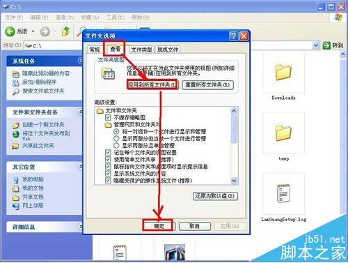 2、在打开的“文件夹选项”对话框中切换到“查看”选项卡,并打击“应用到所有文件夹”,单击“确定”按钮。