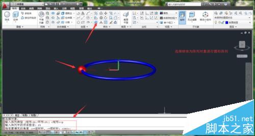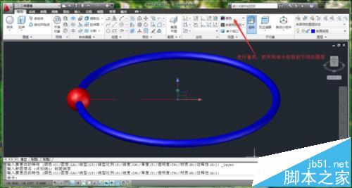 3、选择实体图元中的球体命令,选择前面绘制的直线端点为中心,绘制一个半径为3的球体,如图所示。进行着色处理,分别把环和球放到不同的图层,图层设置请参考下面的经验链接。