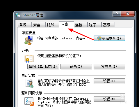 3、接着进入Internet属性的界面,找到内容,如图所示