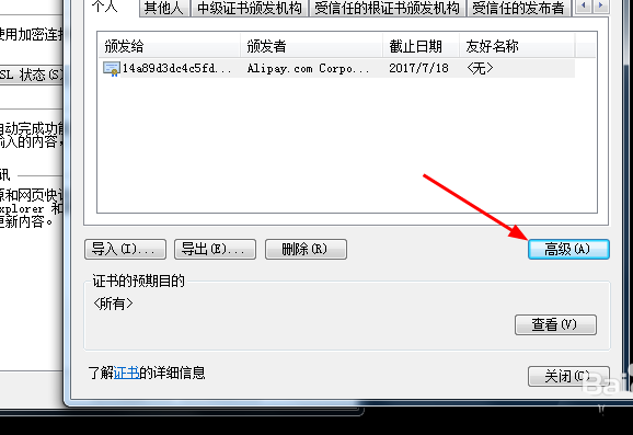 5、当进入证书的界面,就能看到高级的图标,如图所示